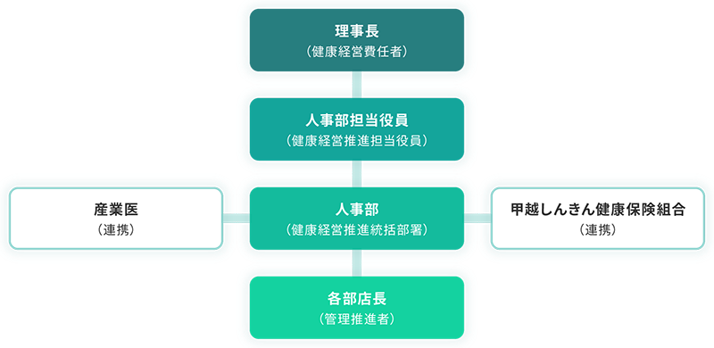 この理念を達成するためには、まず職員自らが心身ともに健康で快活に仕事をすることが大切であり、働きやすい職場環境をつくることにより、職員一人ひとりが持つ能力を最大限に発揮することができると考えています。そのために大切な経営資源である職員の健康維持・増進のサポートに経営者自らが関与し、活力ある健全な組織をつくり、地域金融機関としての使命を果たしてまいります。