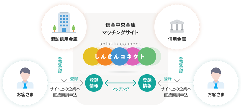 信用金庫のネットワークを活用した信用金庫のお客さまのためのビジネスマッチングサイトです。自社のマッチングニーズを登録することで、気になる企業にサイト上で直接商談を申し込むことができます。その他、信用金庫が主催するビジネスフェアや商談会、販路支援施策のほか、参考となるビジネスマッチングの成功事例などもご案内しています。